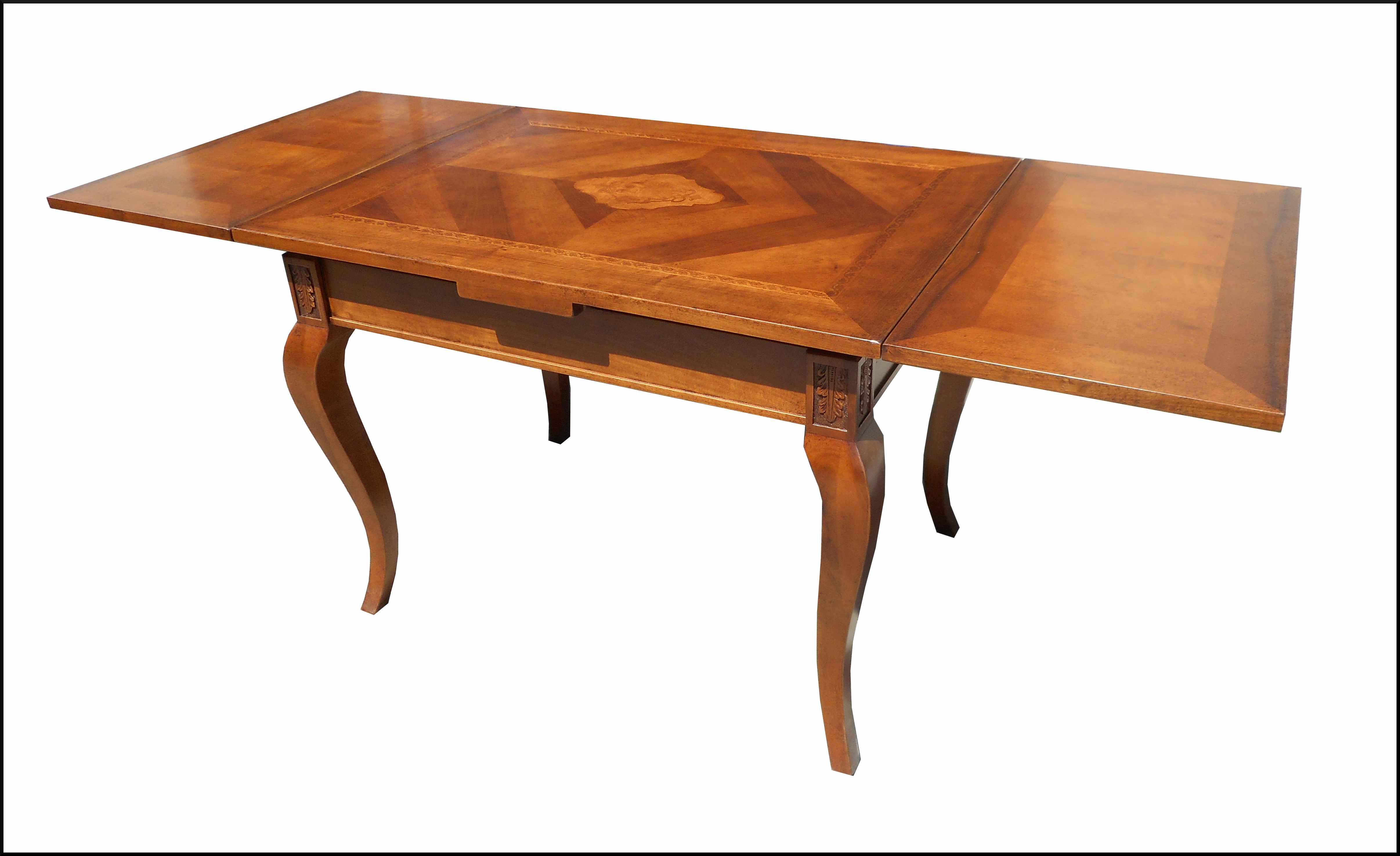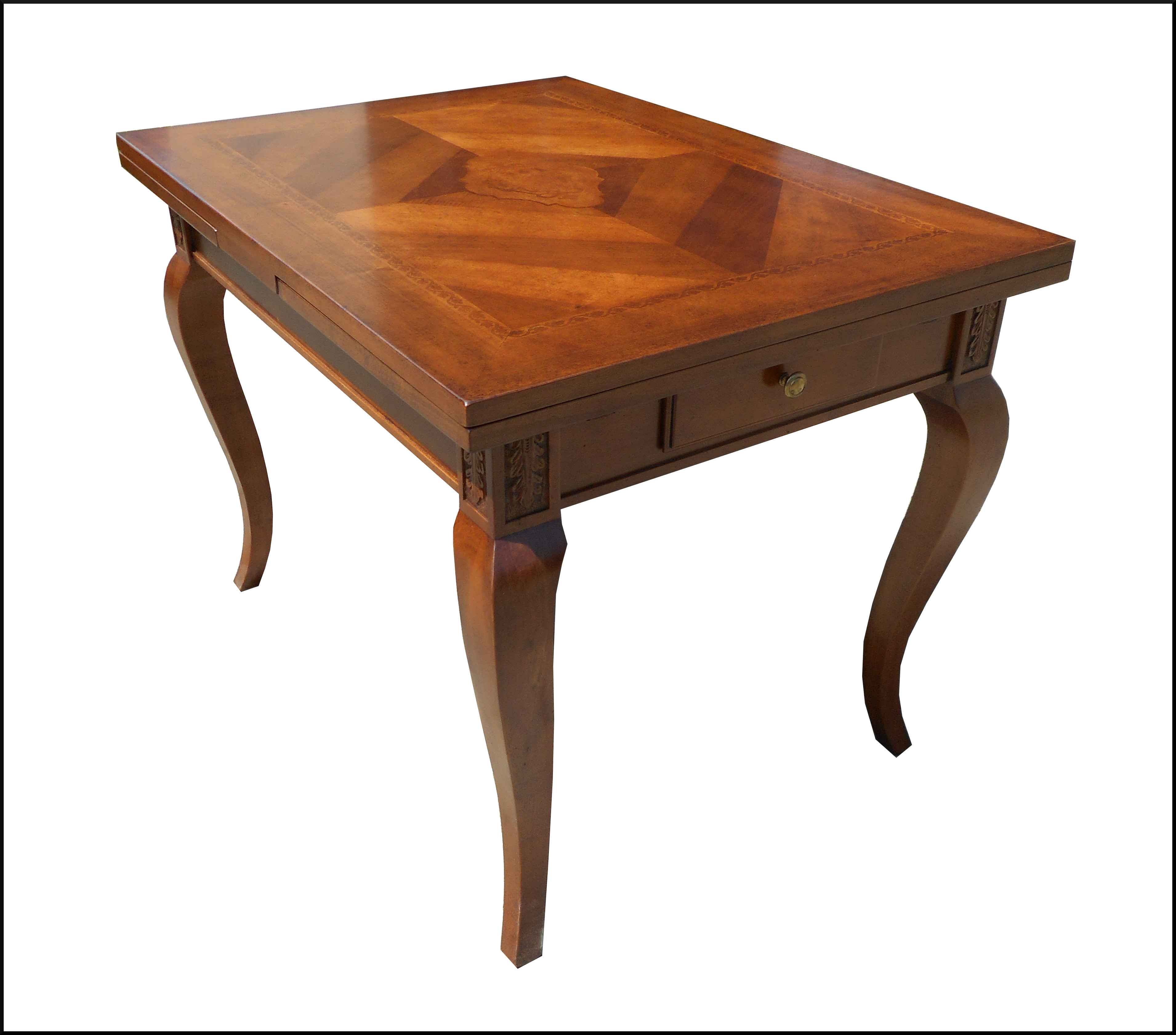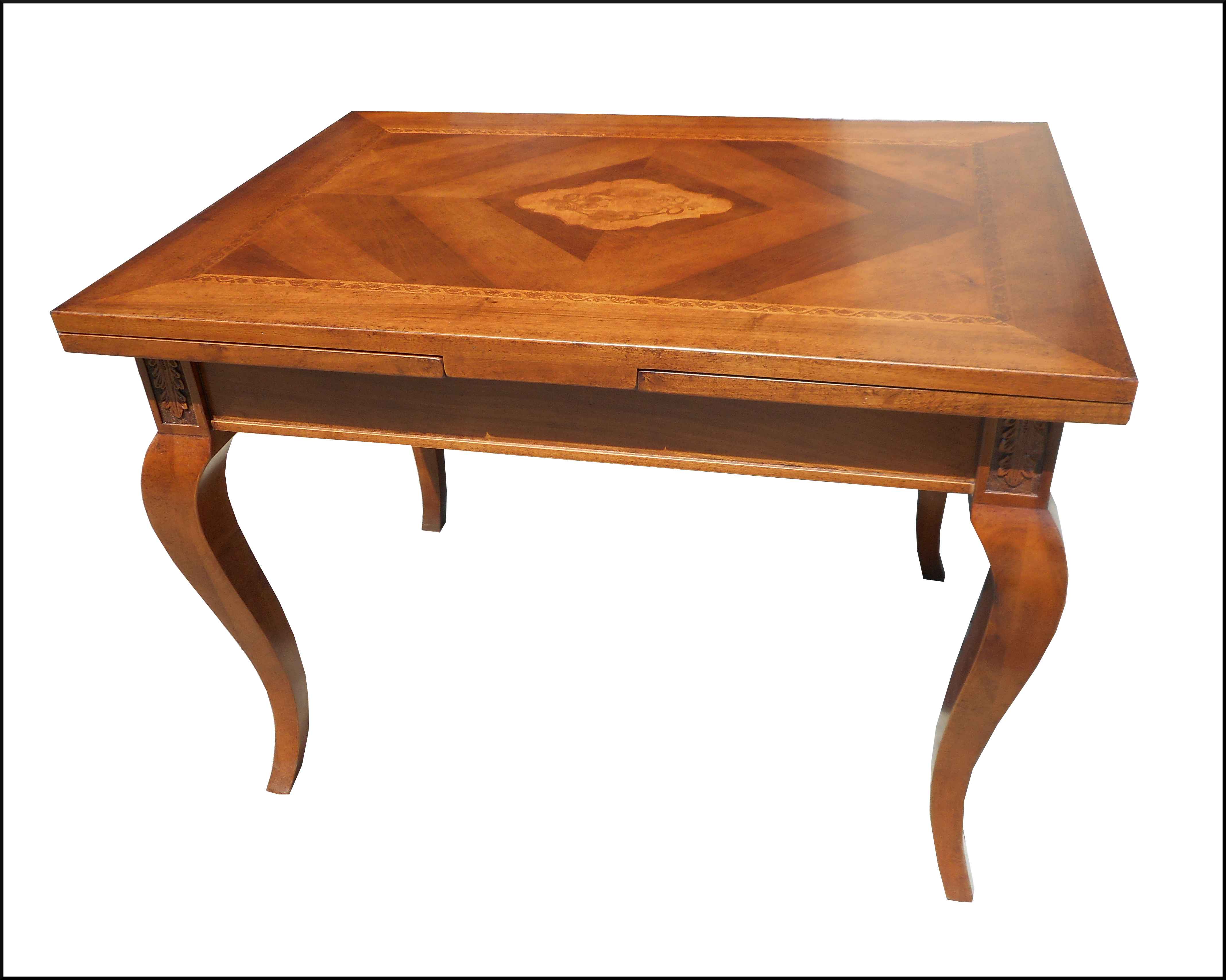 - Elegante e raffinato tavolo realizzato con piano intarsiato e gambe mosse con intaglio