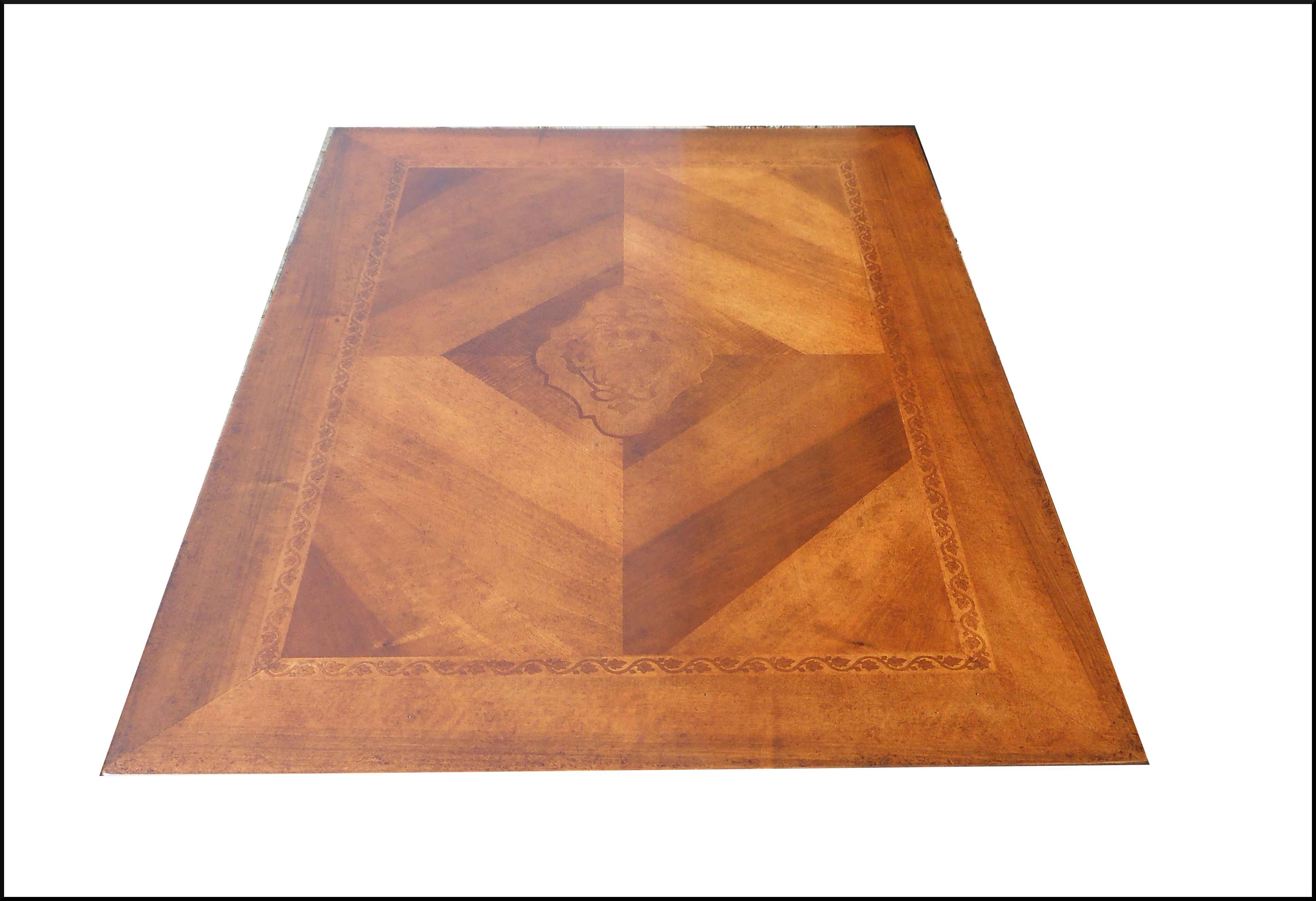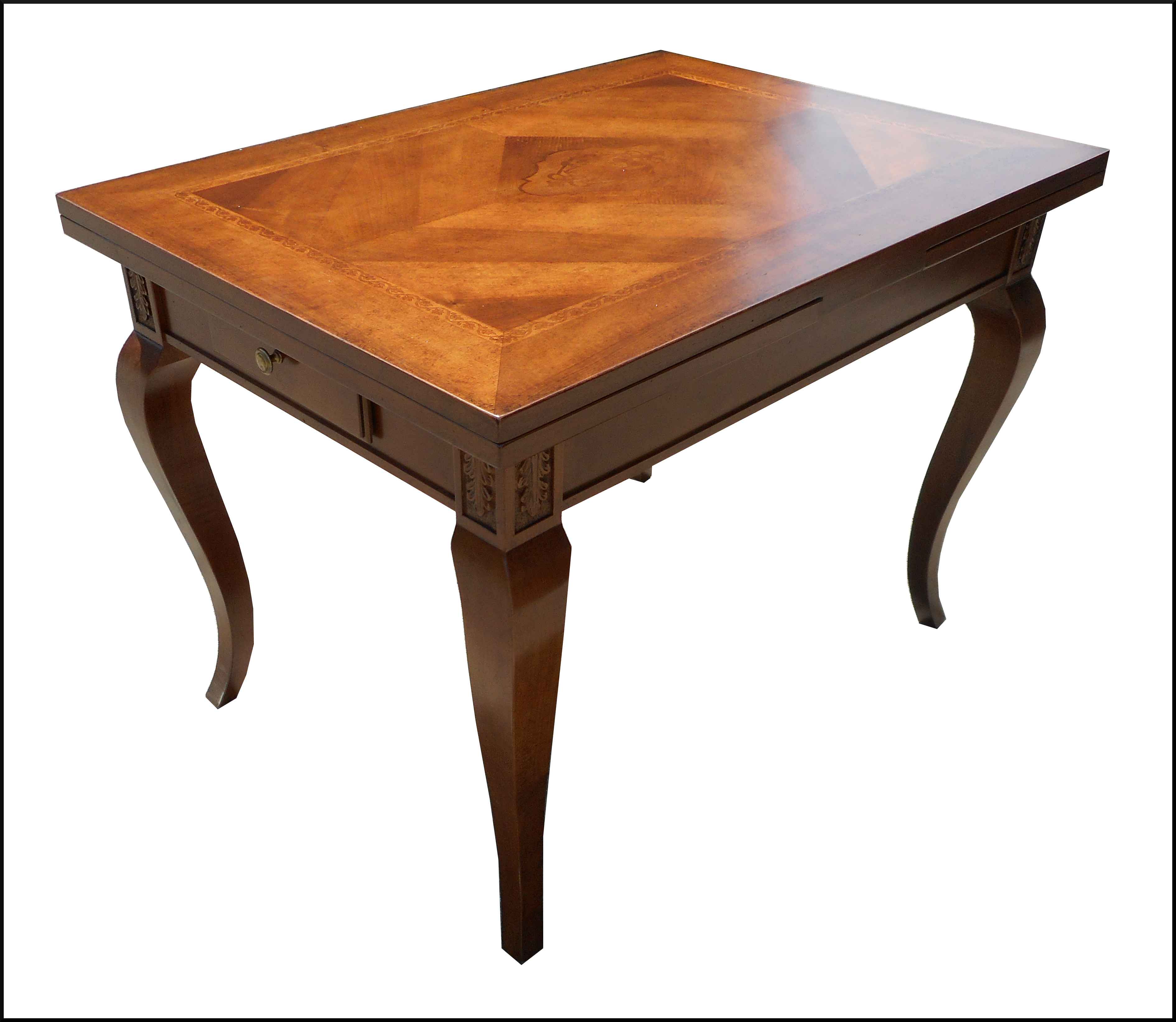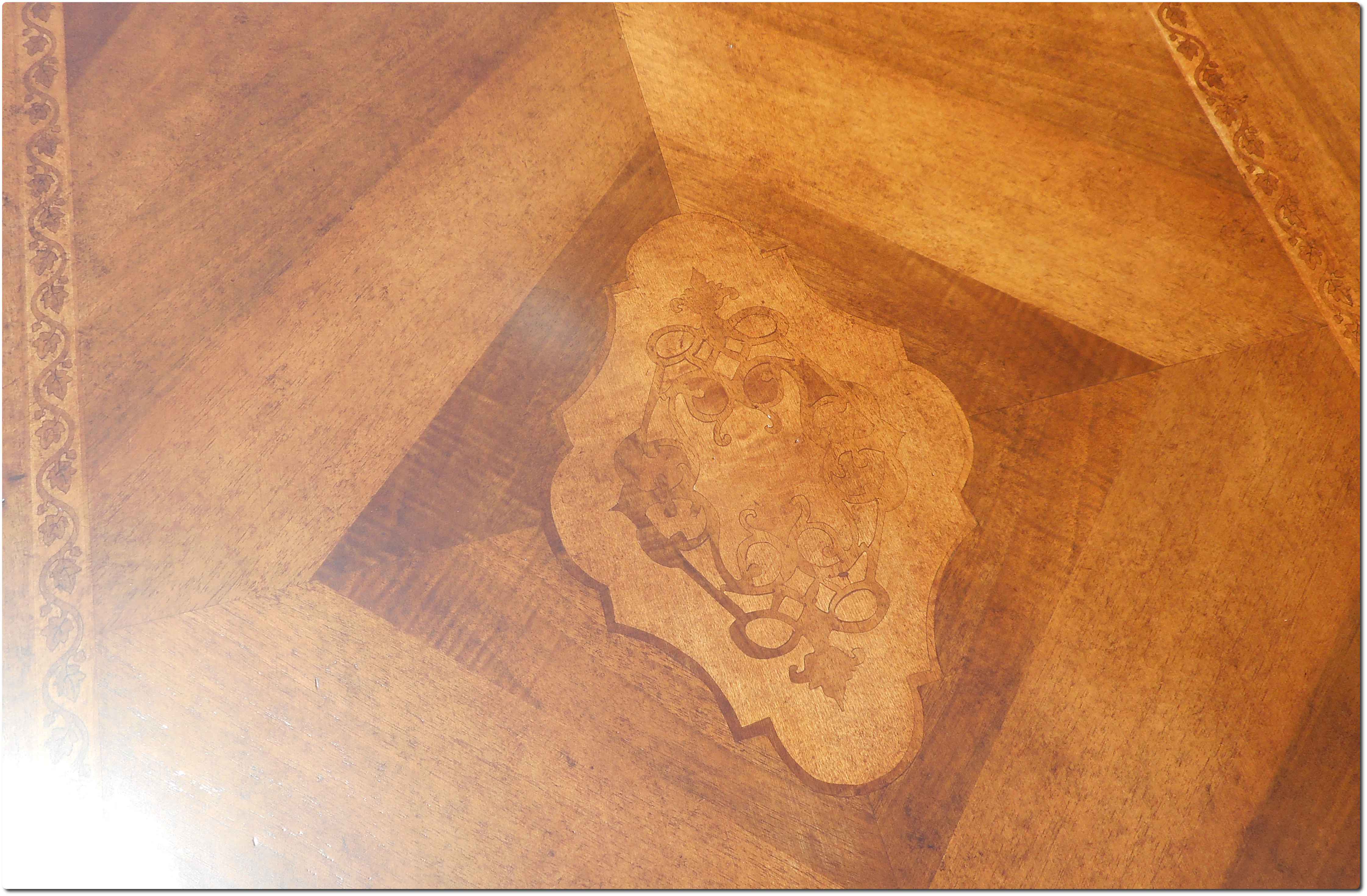 - Elegante e raffinato tavolo realizzato con piano intarsiato e gambe mosse con intaglio